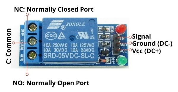 5 Volts 1-Channel relay module is an interface board that is compatible with Arduino, AVR, PIC, ARM, etc. This module can work in a high current like AC250V 10A or DC30V 10A. It controls larger loads and devices like DC motors, AC motors, and other AC and DC devices with the digital outputs from controllers and processors. It is a 1-channel relay module, so it can control any 1 device. Each relay or channel of 1 channel relay module needs 15-20mA driver current and 5 Volts supply.