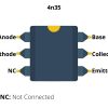 4N35 is a 1-channel optocoupler with gallium arsenide LED and silicon NPN phototransistor. The device comes in a 6 pin plastic DIP package.
