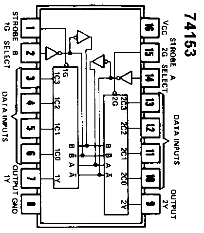 74153 is a data multiplexer or data selector IC. It has inverters and drivers that supply fully complementary data selection to the AND-OR-NOT gates. It also has on-chip and binary decoding. It has 2 1 of 4 data multiplexer in one IC package. Separate data enables are available for each multiplexer.