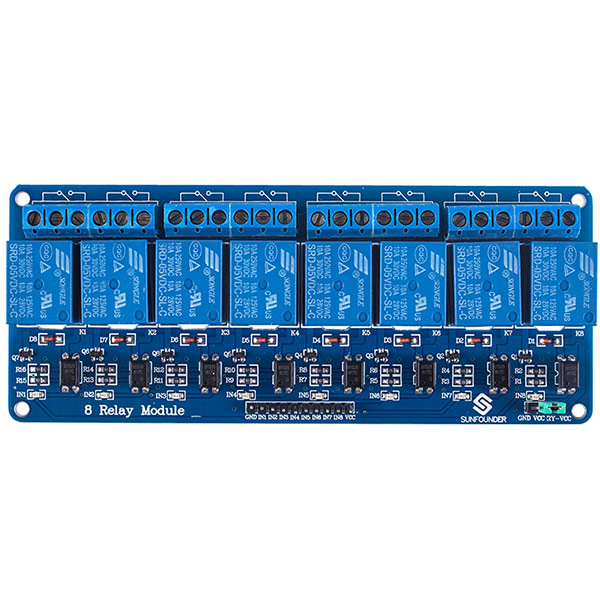 5 Volts 8 Channel relay module is an interface board that is compatible with Arduino, AVR, PIC, ARM, etc. This module can work in a high current like AC250V 10A or DC30V 10A. It controls larger loads and devices like DC motors, AC motors and other AC and DC devices with the digital outputs from controllers and processors. It is an 8-channel relay module, so it can control any 8 devices. Each relay or channel of 8 channel relay module needs 15-20mA driver current and 5 Volts supply.