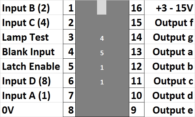 4511 is a 7-segment driver IC or BCD to 7-segment with CMOS technology and NPN transistor output. The IC features low quiescent power dissipation and high noise immunity.